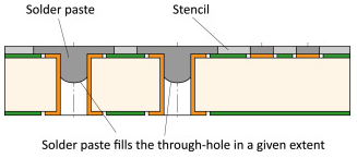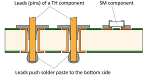 在把錫膏順利印刷到鍍通孔后,自動(dòng)放置機(jī)會(huì)拾取通孔插裝元件插入通孔中。通孔元件的引腳撕裂鍍通孔中的錫膏,并將一部分錫膏膏推到底部。底部的錫膏在回流熔融時(shí)會(huì)通過(guò)毛細(xì)作用流回鍍通孔中,從而完全填充鍍通孔內(nèi)部。