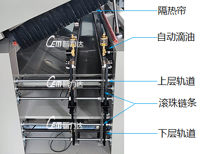 1 雙層導軌結構,上下層閉環單獨控制,上層報警不影響 2 采用進口飛利浦中波紅外線燈管,配合鏡面反射板, 下層工作; 專利板面測溫補償模 式,實測溫度精度高